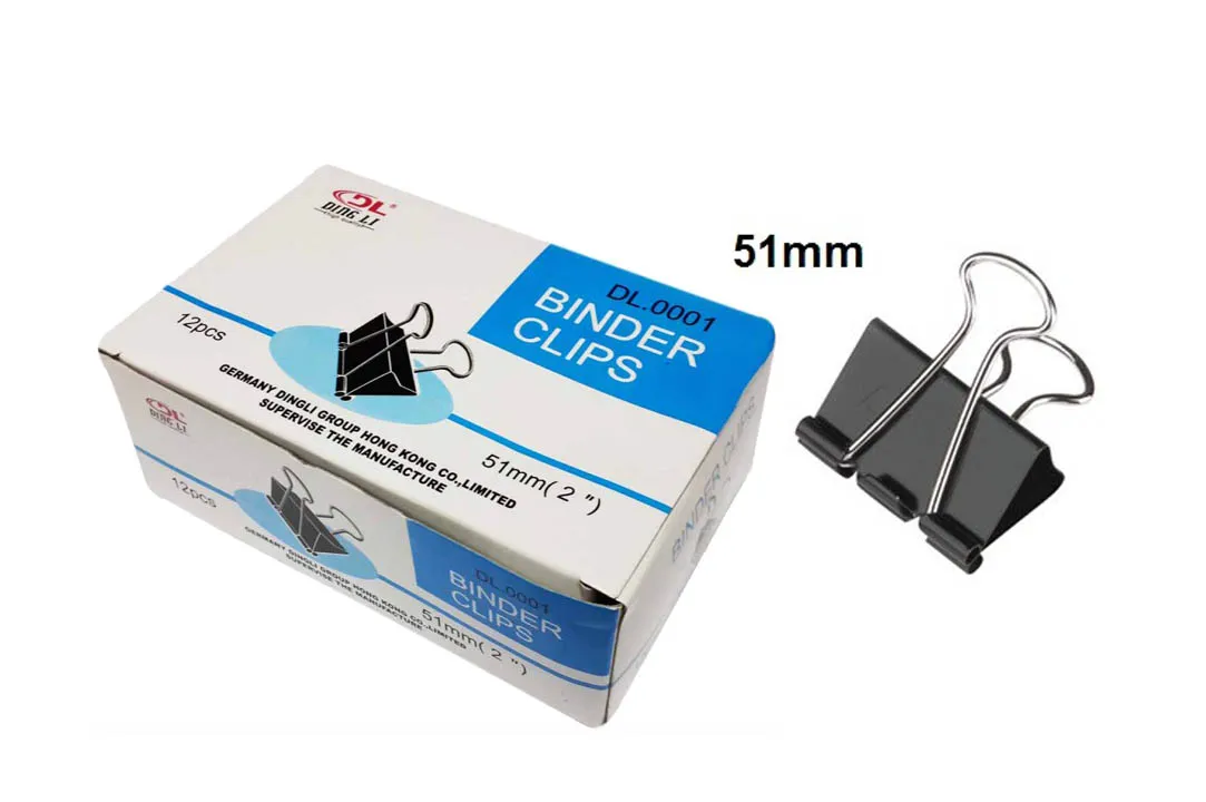 مشابك ضغط أو مشابك ربط مقاس 51 مم من ماركة DL Office. تأتي في الباكت يحتوي على 12مشبكًا، مع لمسة نهائية مطلية بالنيكل مع طلاء مقاوم للصدأ وشفاه لمزيد من الراحة في الاستخدام وبألوان مختلفة بألوان الباستيل.