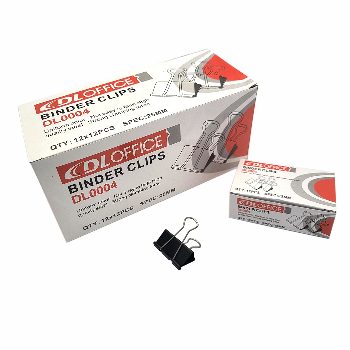 مشابك ضغط أو مشابك ربط مقاس 25 مم من ماركة DL Office. تأتي في باكت يحتوي على 12مشبكًا، مع لمسة نهائية مطلية بالنيكل مع طلاء مقاوم للصدأ